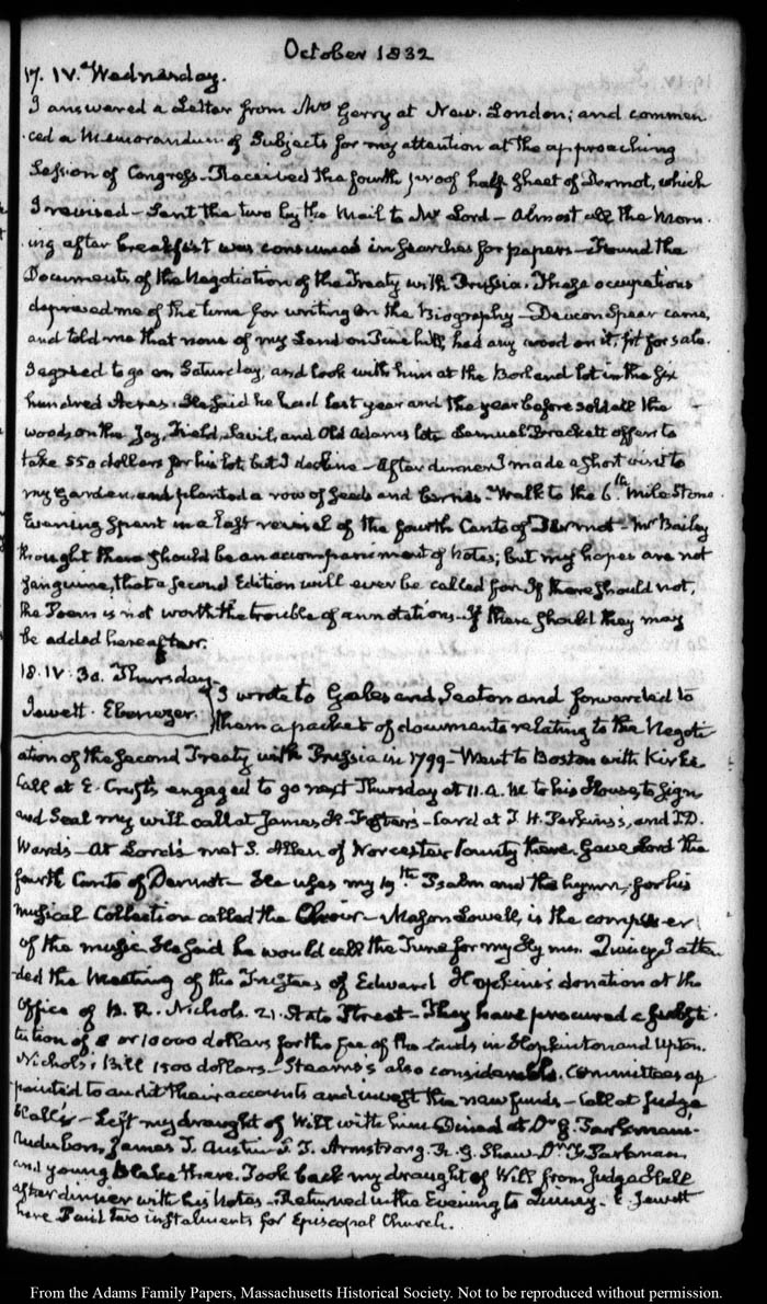 View full, authoritative transcriptions with page images of the diaries at John Quincy Adams Digital Diary part of the Primary Source Cooperative at the MHS.