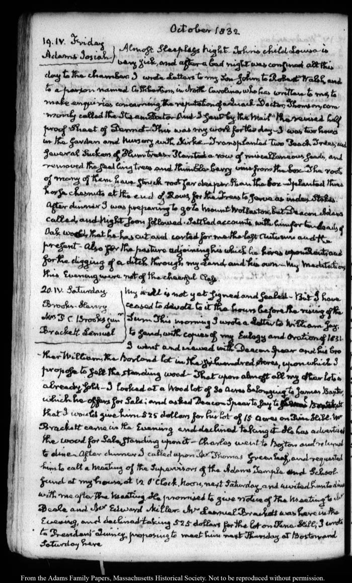 View full, authoritative transcriptions with page images of the diaries at John Quincy Adams Digital Diary part of the Primary Source Cooperative at the MHS.