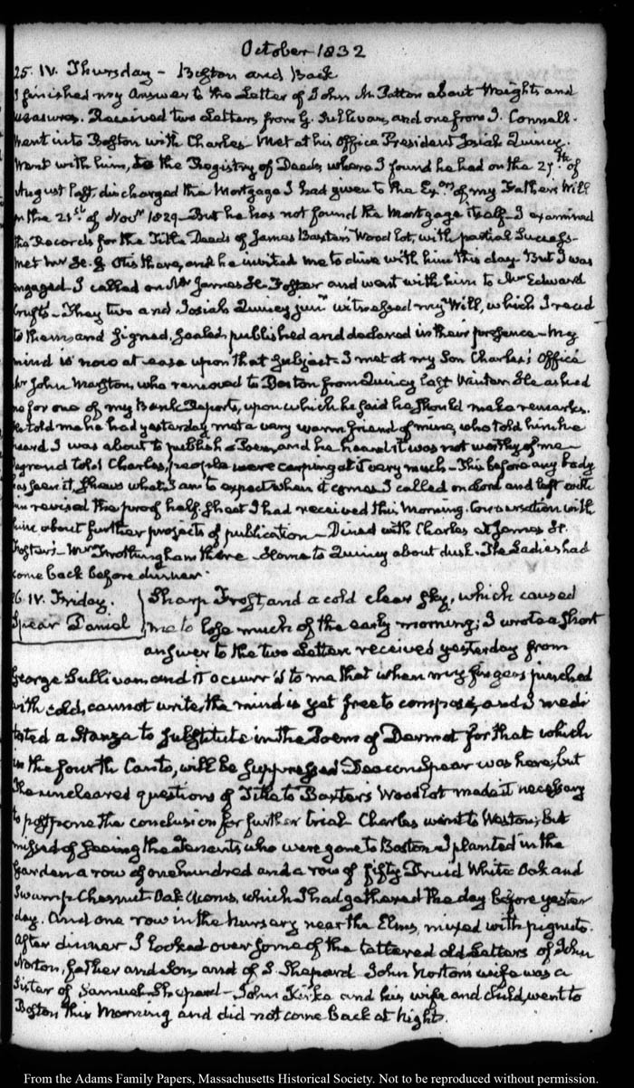 View full, authoritative transcriptions with page images of the diaries at John Quincy Adams Digital Diary part of the Primary Source Cooperative at the MHS.