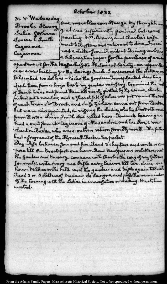 View full, authoritative transcriptions with page images of the diaries at John Quincy Adams Digital Diary part of the Primary Source Cooperative at the MHS.