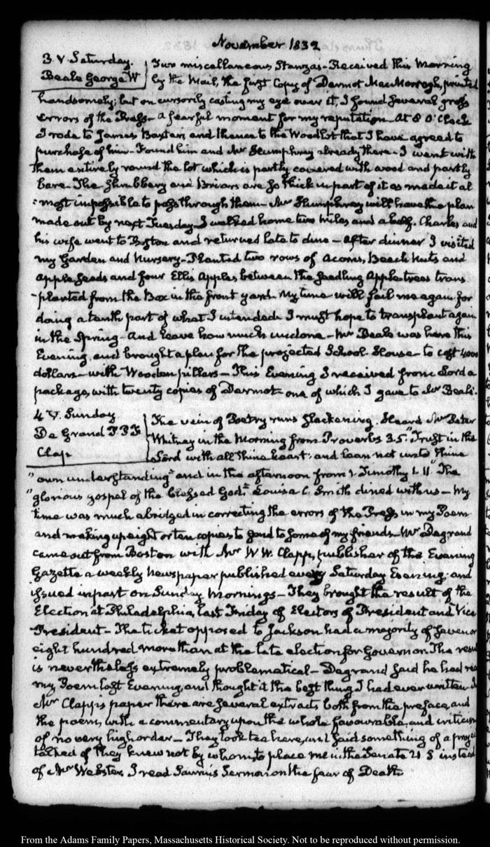 View full, authoritative transcriptions with page images of the diaries at John Quincy Adams Digital Diary part of the Primary Source Cooperative at the MHS.