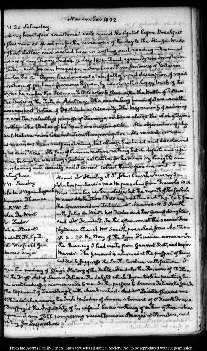 View full, authoritative transcriptions with page images of the diaries at John Quincy Adams Digital Diary part of the Primary Source Cooperative at the MHS.