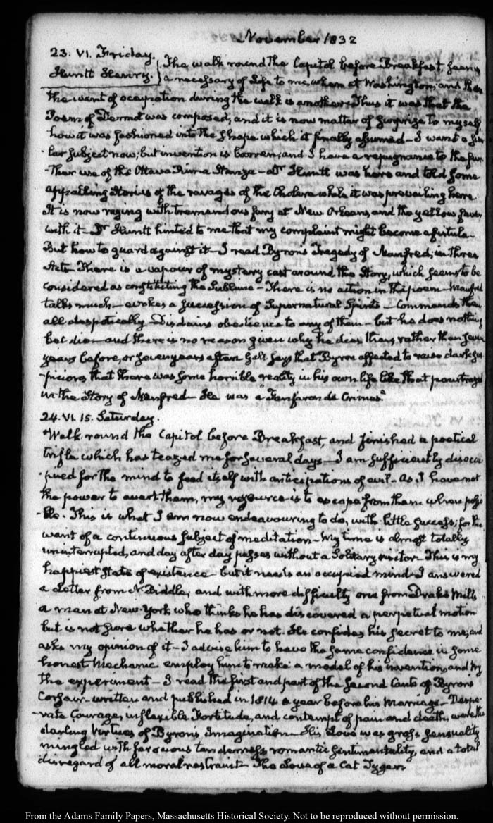 View full, authoritative transcriptions with page images of the diaries at John Quincy Adams Digital Diary part of the Primary Source Cooperative at the MHS.