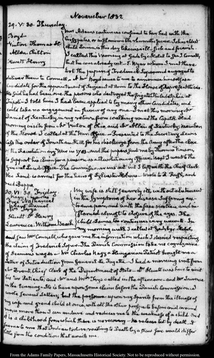 View full, authoritative transcriptions with page images of the diaries at John Quincy Adams Digital Diary part of the Primary Source Cooperative at the MHS.