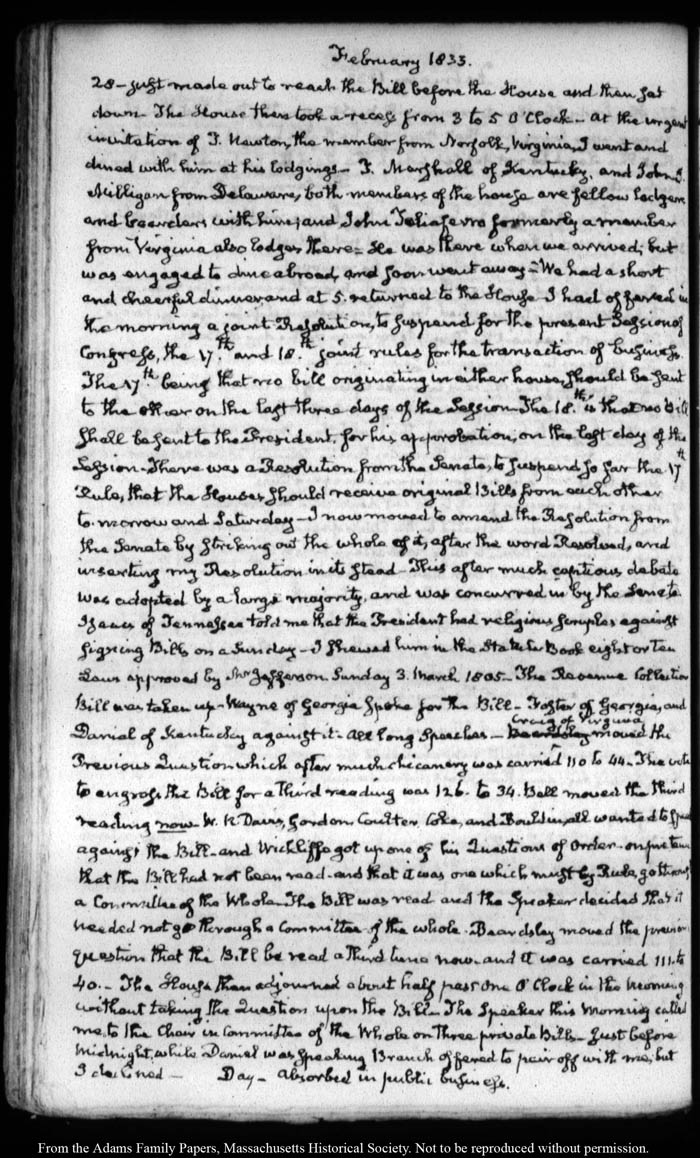 View full, authoritative transcriptions with page images of the diaries at John Quincy Adams Digital Diary part of the Primary Source Cooperative at the MHS.