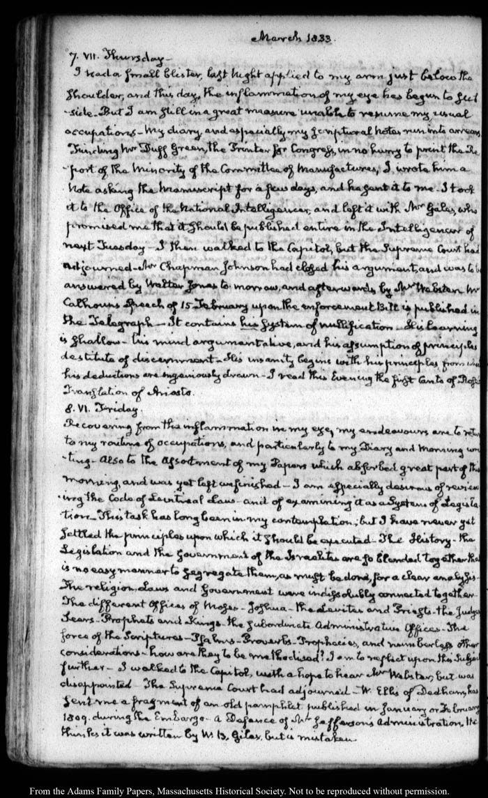 View full, authoritative transcriptions with page images of the diaries at John Quincy Adams Digital Diary part of the Primary Source Cooperative at the MHS.