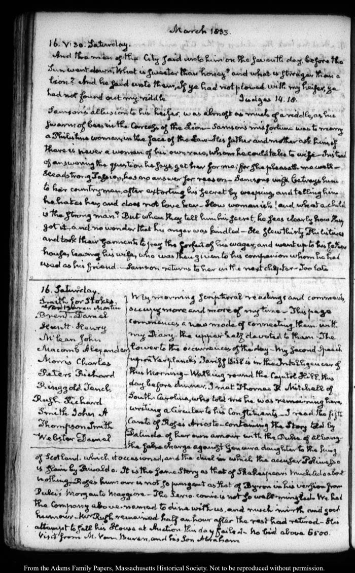 View full, authoritative transcriptions with page images of the diaries at John Quincy Adams Digital Diary part of the Primary Source Cooperative at the MHS.