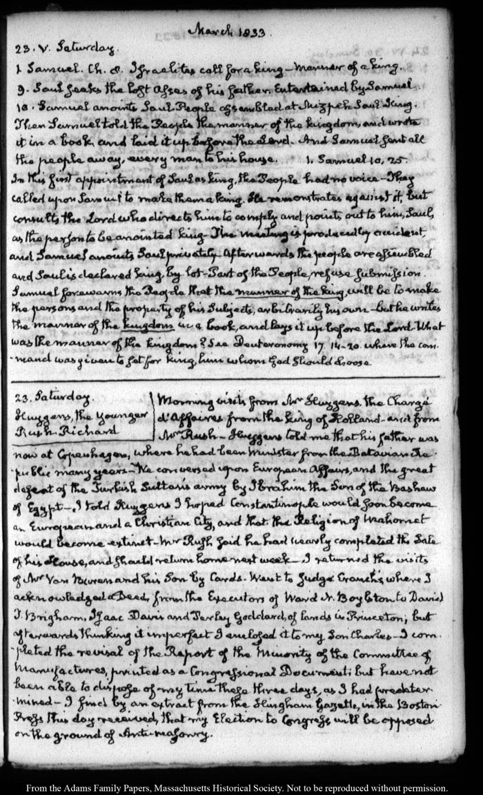 View full, authoritative transcriptions with page images of the diaries at John Quincy Adams Digital Diary part of the Primary Source Cooperative at the MHS.