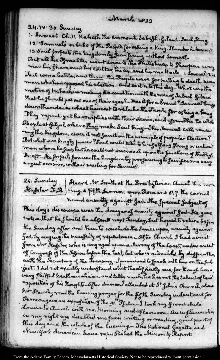 View full, authoritative transcriptions with page images of the diaries at John Quincy Adams Digital Diary part of the Primary Source Cooperative at the MHS.