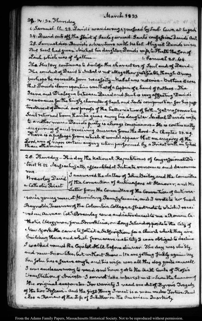 View full, authoritative transcriptions with page images of the diaries at John Quincy Adams Digital Diary part of the Primary Source Cooperative at the MHS.