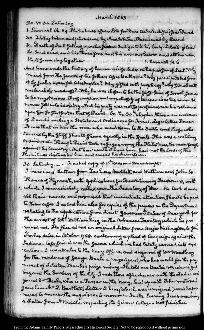 View full, authoritative transcriptions with page images of the diaries at John Quincy Adams Digital Diary part of the Primary Source Cooperative at the MHS.