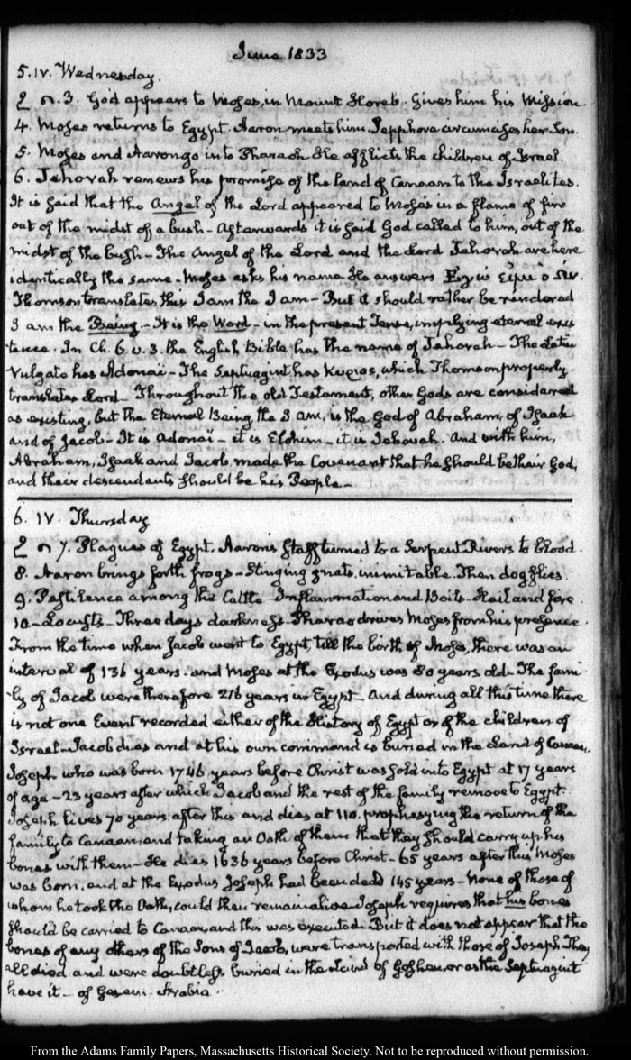 View full, authoritative transcriptions with page images of the diaries at John Quincy Adams Digital Diary part of the Primary Source Cooperative at the MHS.