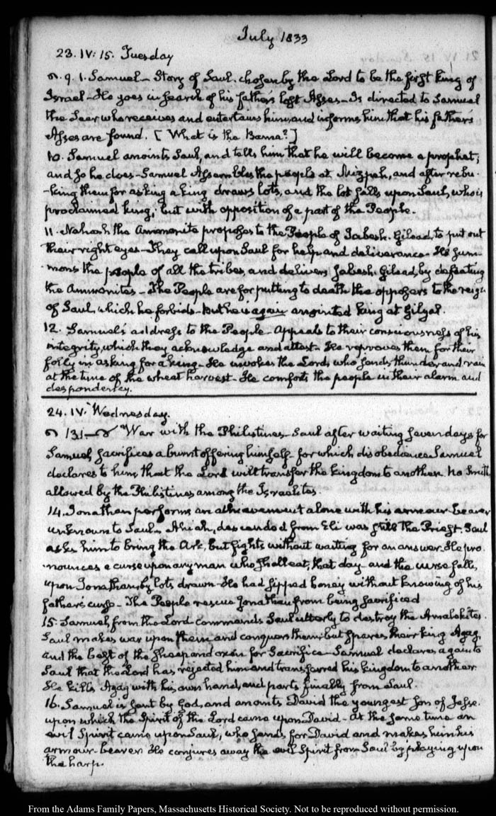 View full, authoritative transcriptions with page images of the diaries at John Quincy Adams Digital Diary part of the Primary Source Cooperative at the MHS.