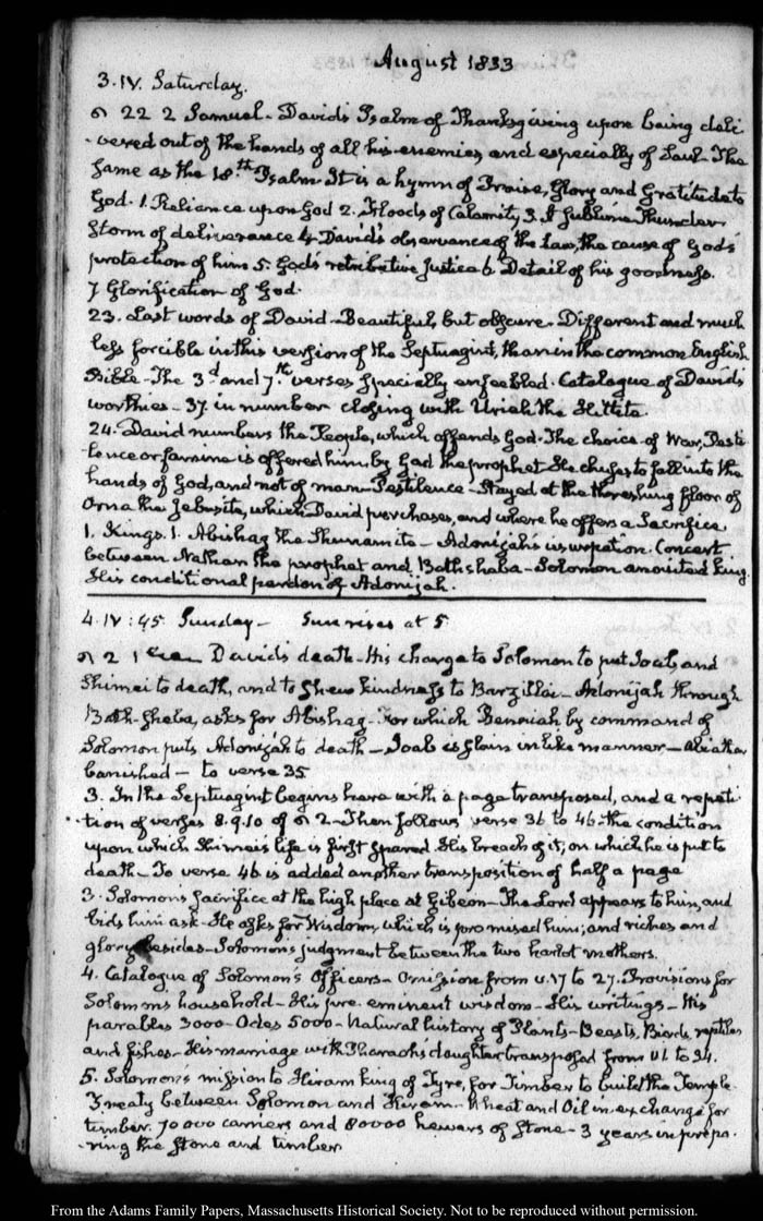 View full, authoritative transcriptions with page images of the diaries at John Quincy Adams Digital Diary part of the Primary Source Cooperative at the MHS.