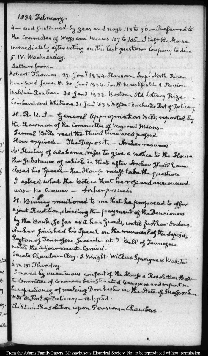 View full, authoritative transcriptions with page images of the diaries at John Quincy Adams Digital Diary part of the Primary Source Cooperative at the MHS.