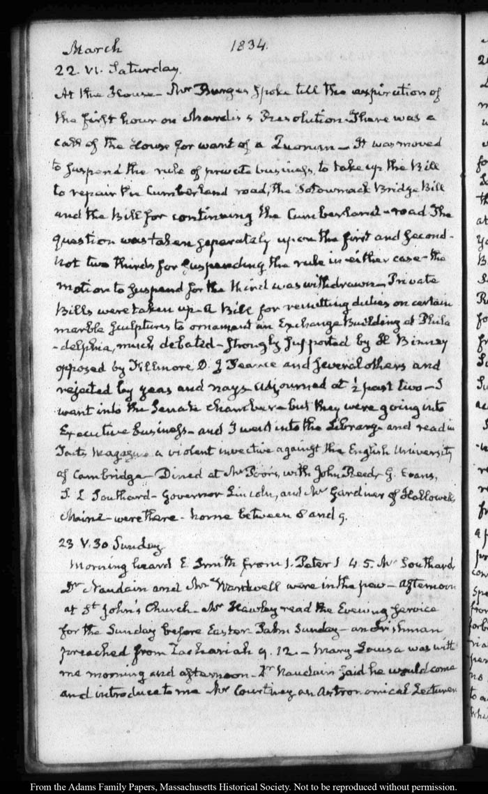 View full, authoritative transcriptions with page images of the diaries at John Quincy Adams Digital Diary part of the Primary Source Cooperative at the MHS.