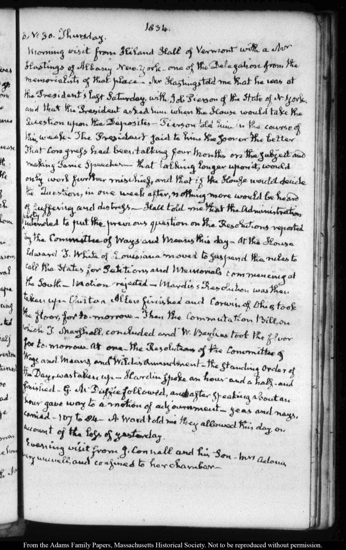 View full, authoritative transcriptions with page images of the diaries at John Quincy Adams Digital Diary part of the Primary Source Cooperative at the MHS.