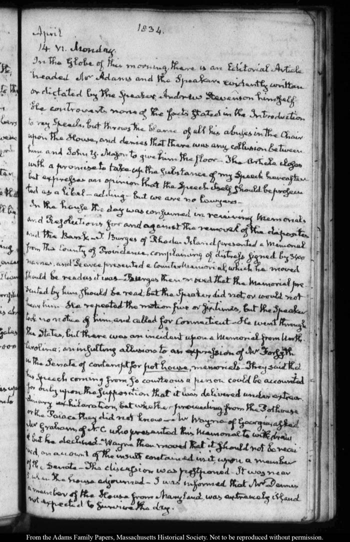 View full, authoritative transcriptions with page images of the diaries at John Quincy Adams Digital Diary part of the Primary Source Cooperative at the MHS.