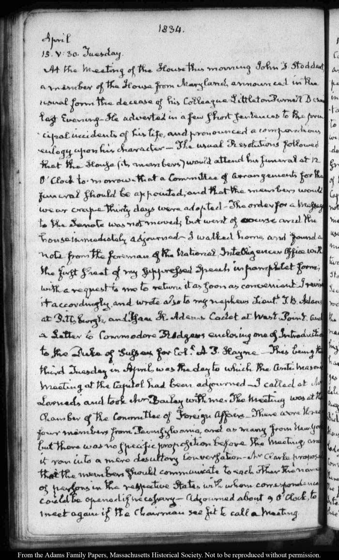 View full, authoritative transcriptions with page images of the diaries at John Quincy Adams Digital Diary part of the Primary Source Cooperative at the MHS.
