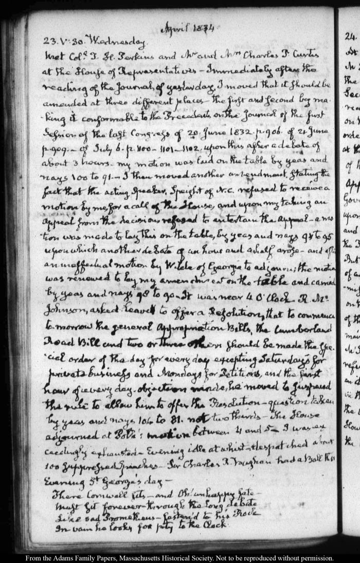 View full, authoritative transcriptions with page images of the diaries at John Quincy Adams Digital Diary part of the Primary Source Cooperative at the MHS.