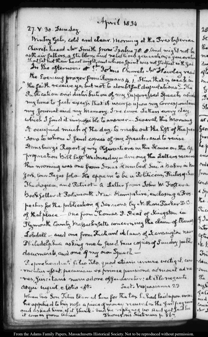 View full, authoritative transcriptions with page images of the diaries at John Quincy Adams Digital Diary part of the Primary Source Cooperative at the MHS.