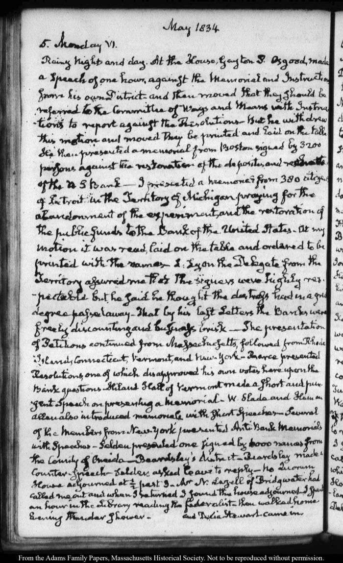 View full, authoritative transcriptions with page images of the diaries at John Quincy Adams Digital Diary part of the Primary Source Cooperative at the MHS.