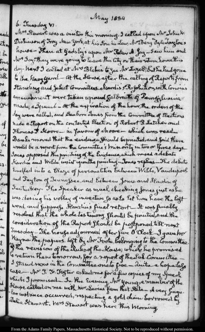 View full, authoritative transcriptions with page images of the diaries at John Quincy Adams Digital Diary part of the Primary Source Cooperative at the MHS.