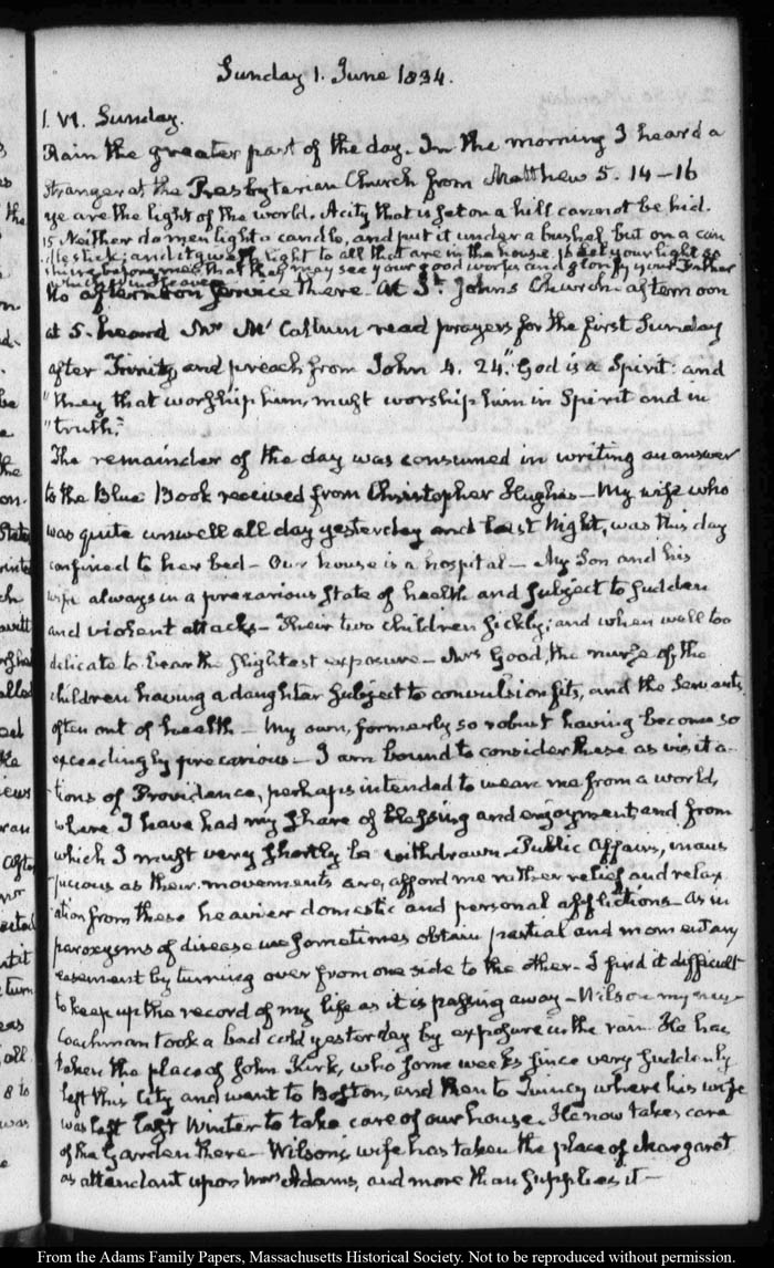 View full, authoritative transcriptions with page images of the diaries at John Quincy Adams Digital Diary part of the Primary Source Cooperative at the MHS.