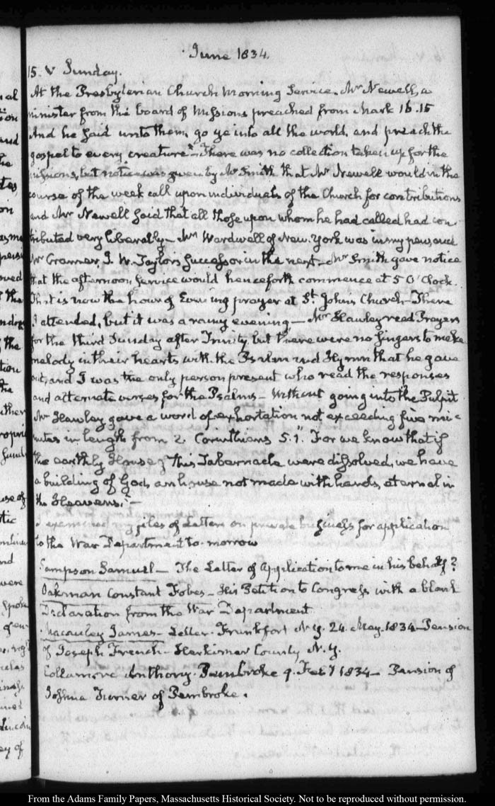 View full, authoritative transcriptions with page images of the diaries at John Quincy Adams Digital Diary part of the Primary Source Cooperative at the MHS.