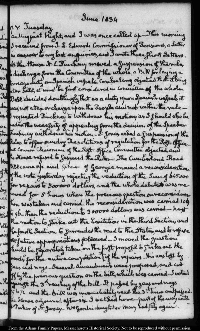 View full, authoritative transcriptions with page images of the diaries at John Quincy Adams Digital Diary part of the Primary Source Cooperative at the MHS.