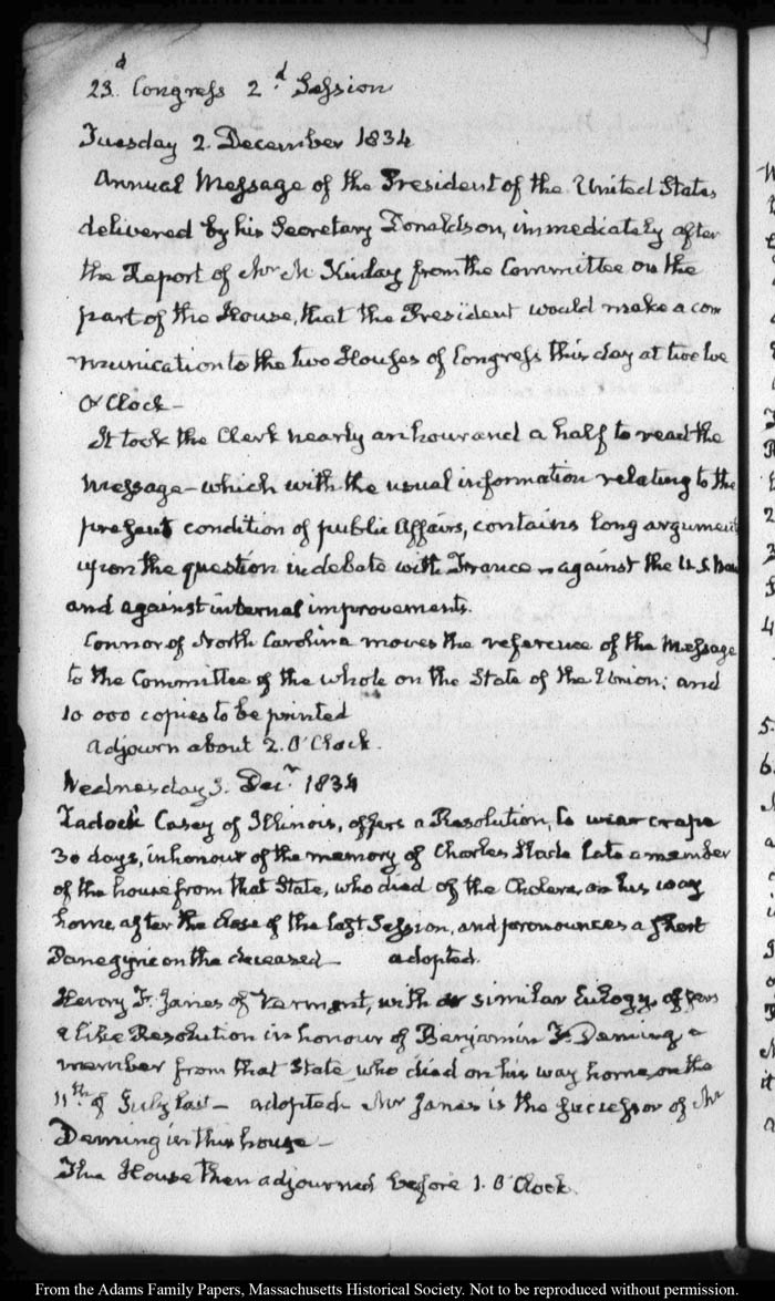 View full, authoritative transcriptions with page images of the diaries at John Quincy Adams Digital Diary part of the Primary Source Cooperative at the MHS.