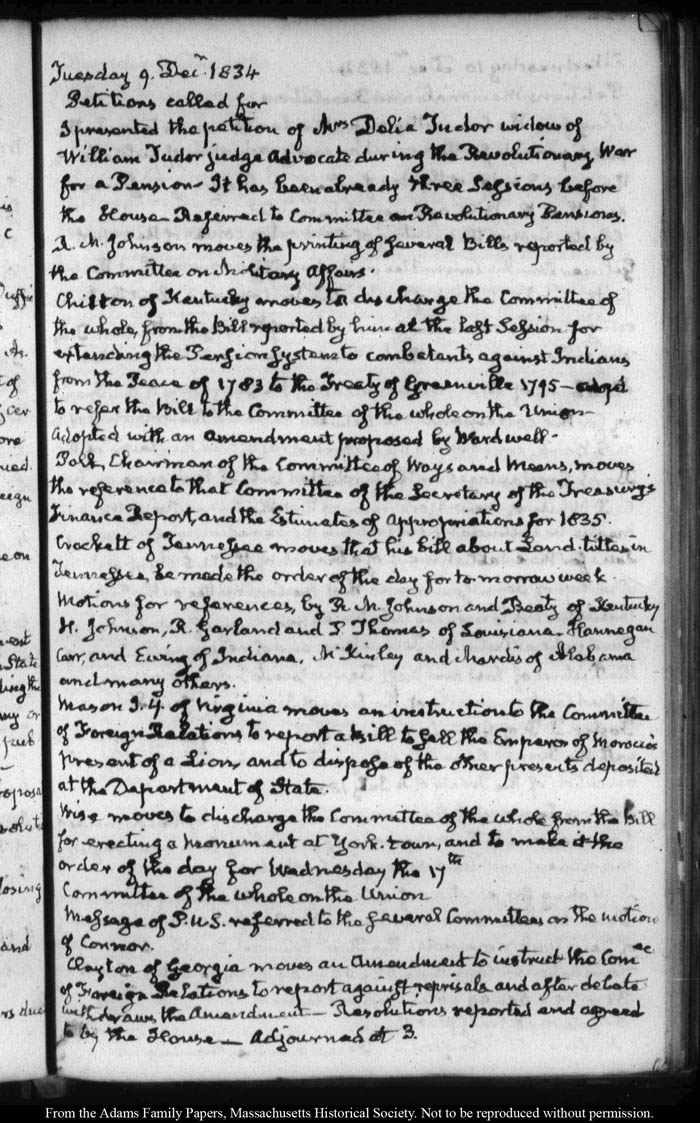 View full, authoritative transcriptions with page images of the diaries at John Quincy Adams Digital Diary part of the Primary Source Cooperative at the MHS.