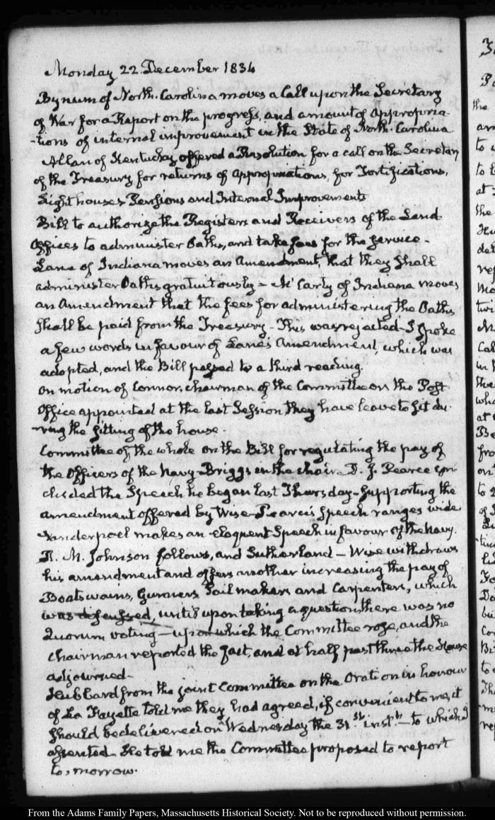 View full, authoritative transcriptions with page images of the diaries at John Quincy Adams Digital Diary part of the Primary Source Cooperative at the MHS.