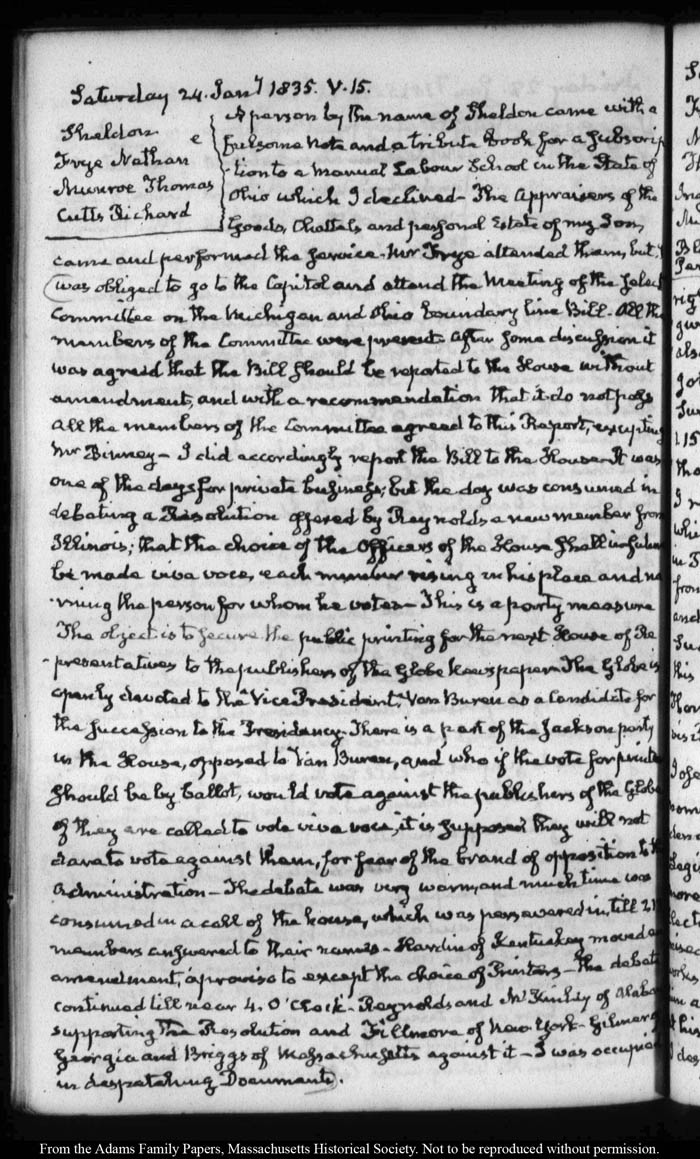 View full, authoritative transcriptions with page images of the diaries at John Quincy Adams Digital Diary part of the Primary Source Cooperative at the MHS.