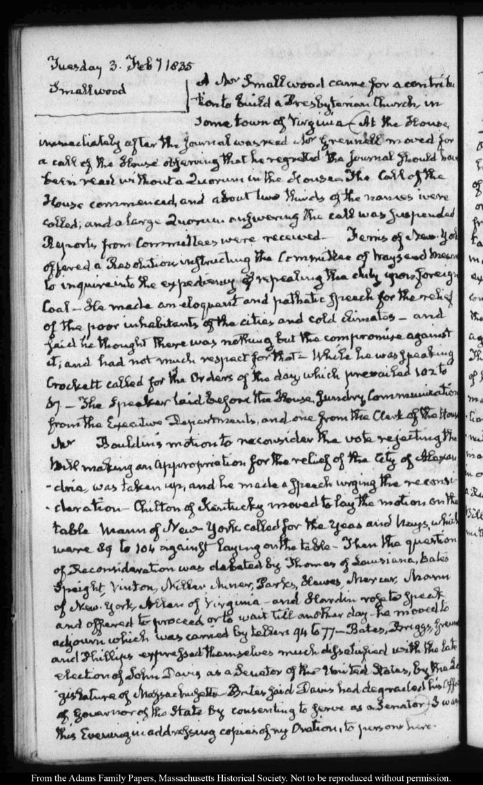 View full, authoritative transcriptions with page images of the diaries at John Quincy Adams Digital Diary part of the Primary Source Cooperative at the MHS.