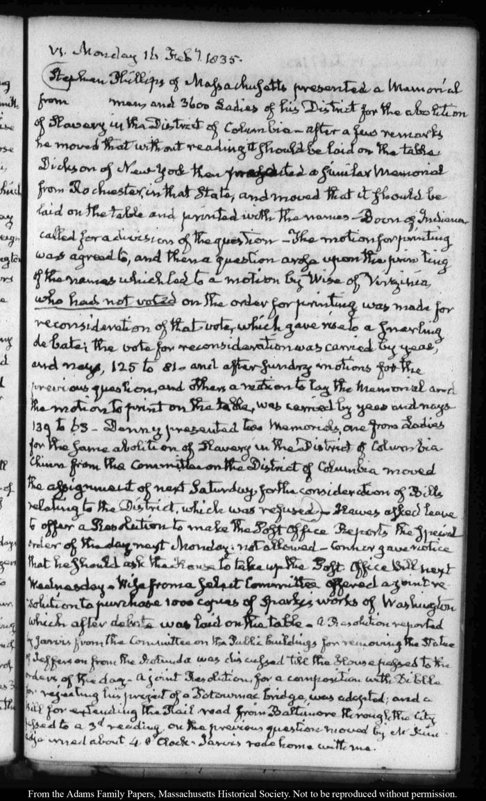 View full, authoritative transcriptions with page images of the diaries at John Quincy Adams Digital Diary part of the Primary Source Cooperative at the MHS.