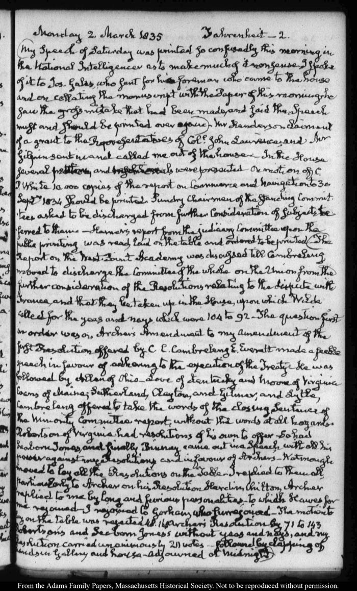 View full, authoritative transcriptions with page images of the diaries at John Quincy Adams Digital Diary part of the Primary Source Cooperative at the MHS.