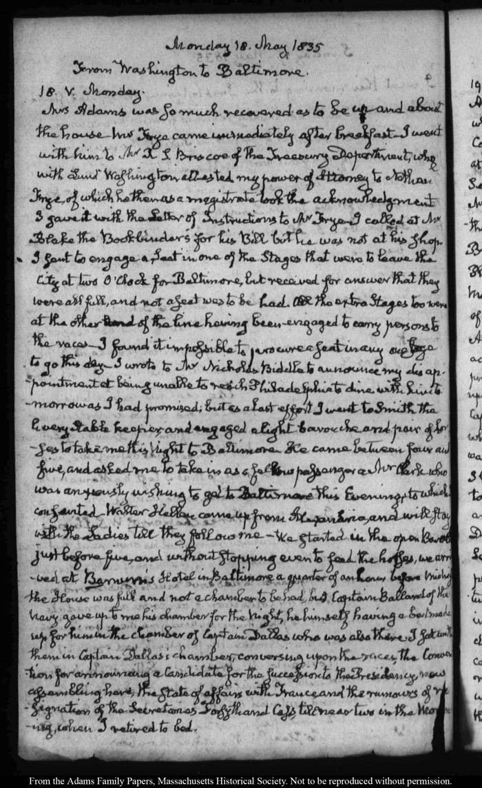 View full, authoritative transcriptions with page images of the diaries at John Quincy Adams Digital Diary part of the Primary Source Cooperative at the MHS.