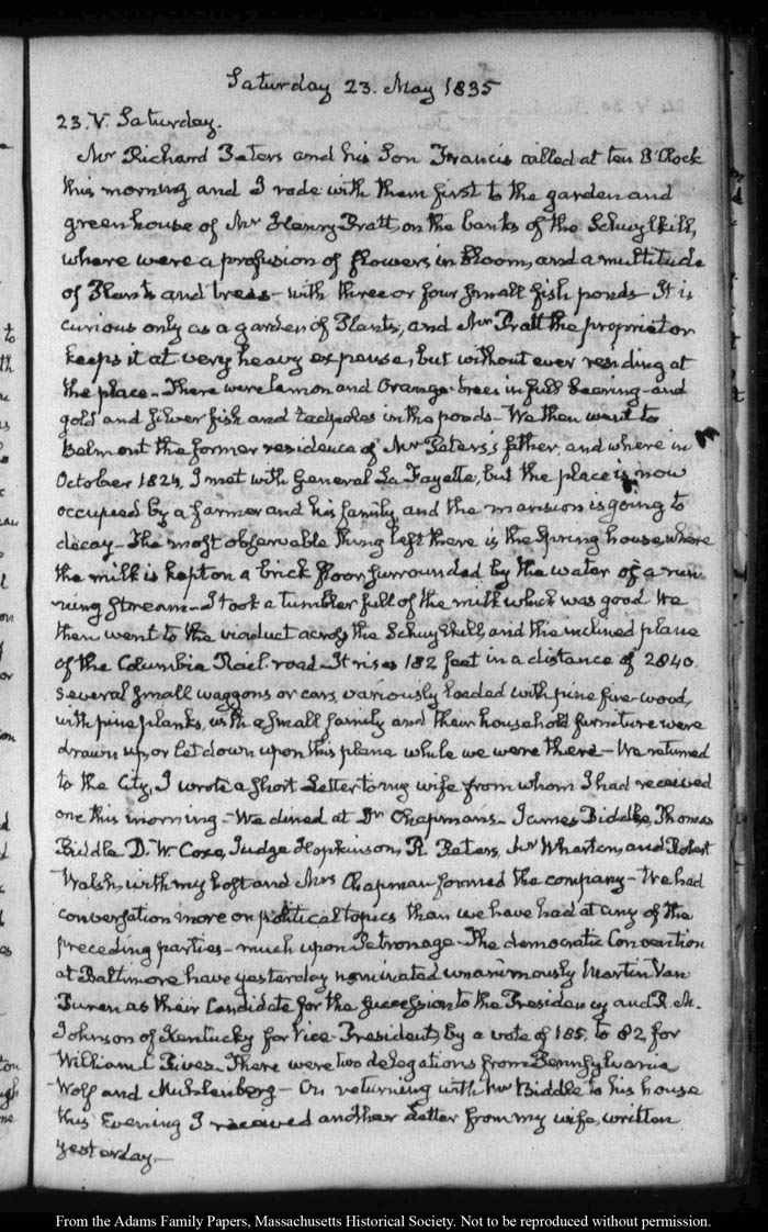 View full, authoritative transcriptions with page images of the diaries at John Quincy Adams Digital Diary part of the Primary Source Cooperative at the MHS.
