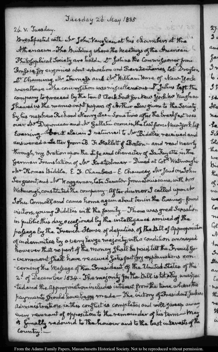View full, authoritative transcriptions with page images of the diaries at John Quincy Adams Digital Diary part of the Primary Source Cooperative at the MHS.