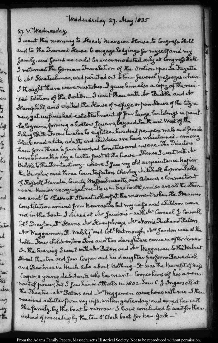 View full, authoritative transcriptions with page images of the diaries at John Quincy Adams Digital Diary part of the Primary Source Cooperative at the MHS.