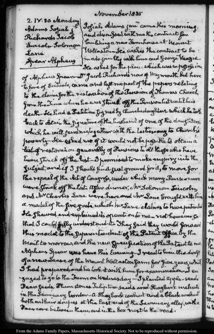View full, authoritative transcriptions with page images of the diaries at John Quincy Adams Digital Diary part of the Primary Source Cooperative at the MHS.