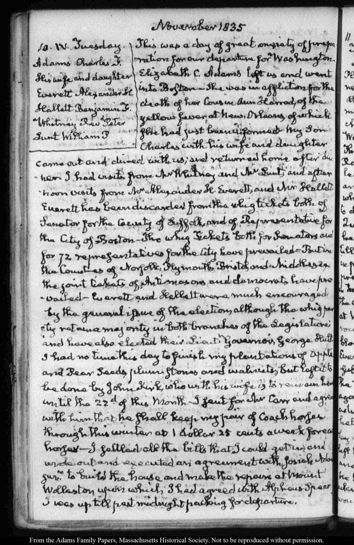 View full, authoritative transcriptions with page images of the diaries at John Quincy Adams Digital Diary part of the Primary Source Cooperative at the MHS.