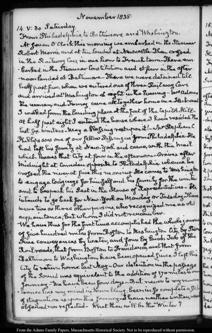 View full, authoritative transcriptions with page images of the diaries at John Quincy Adams Digital Diary part of the Primary Source Cooperative at the MHS.