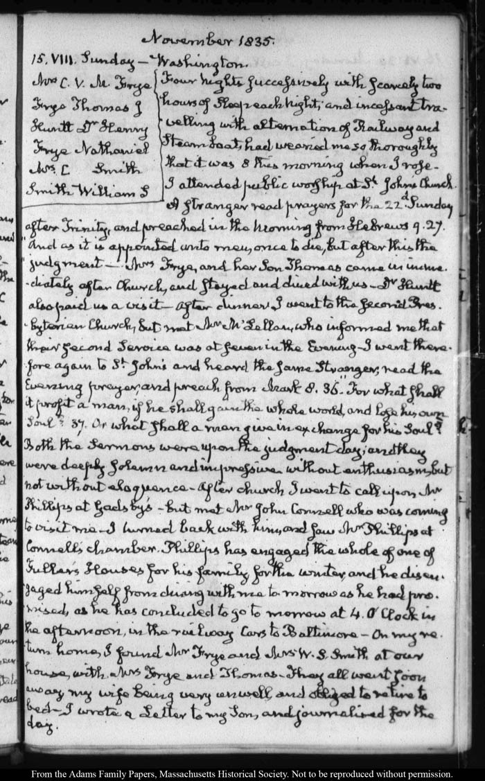 View full, authoritative transcriptions with page images of the diaries at John Quincy Adams Digital Diary part of the Primary Source Cooperative at the MHS.
