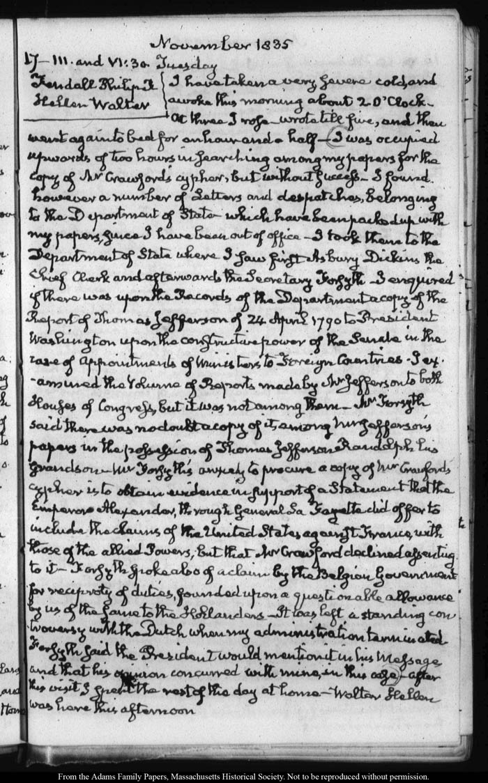 View full, authoritative transcriptions with page images of the diaries at John Quincy Adams Digital Diary part of the Primary Source Cooperative at the MHS.