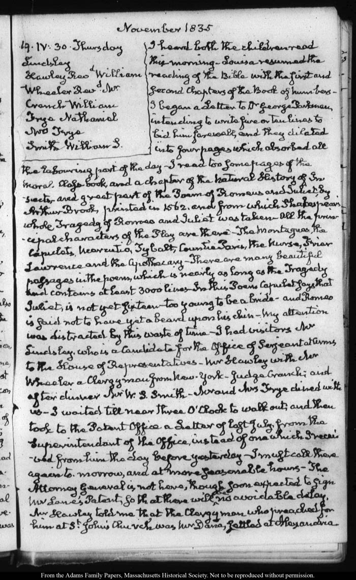 View full, authoritative transcriptions with page images of the diaries at John Quincy Adams Digital Diary part of the Primary Source Cooperative at the MHS.