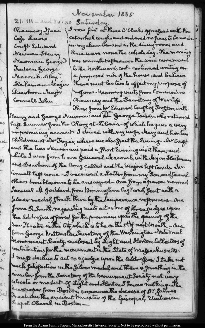 View full, authoritative transcriptions with page images of the diaries at John Quincy Adams Digital Diary part of the Primary Source Cooperative at the MHS.