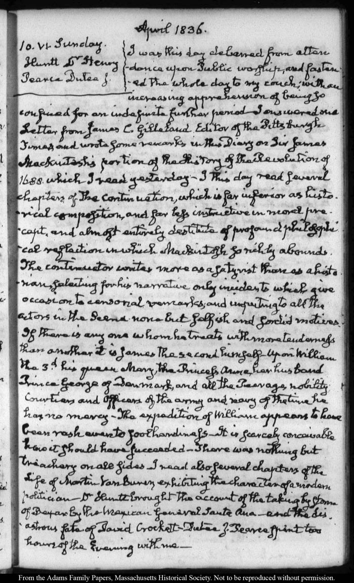 View full, authoritative transcriptions with page images of the diaries at John Quincy Adams Digital Diary part of the Primary Source Cooperative at the MHS.