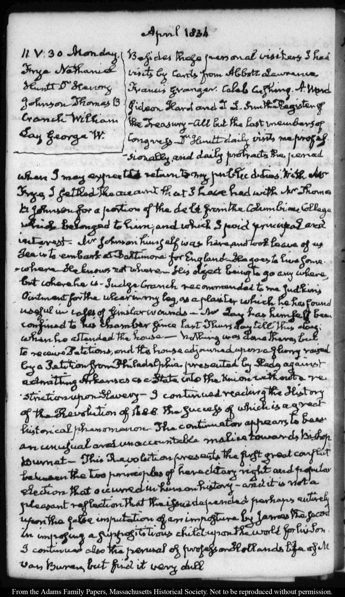 View full, authoritative transcriptions with page images of the diaries at John Quincy Adams Digital Diary part of the Primary Source Cooperative at the MHS.